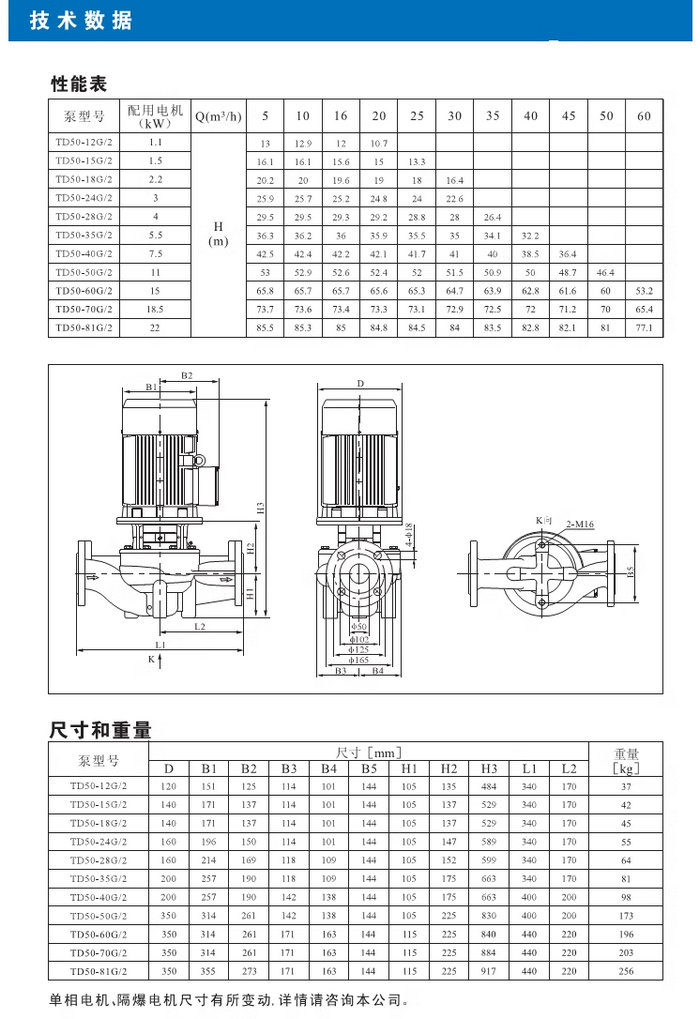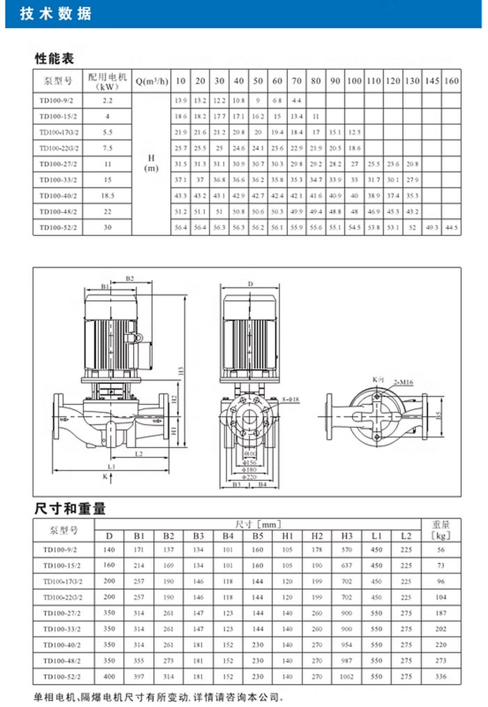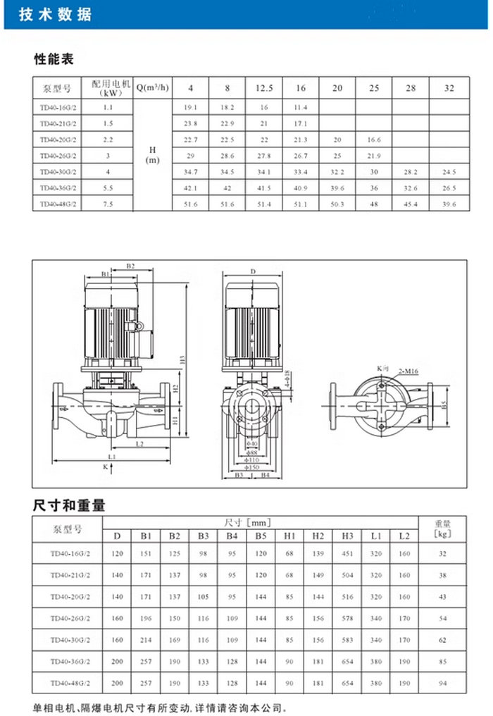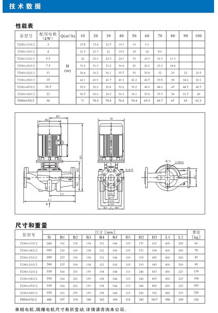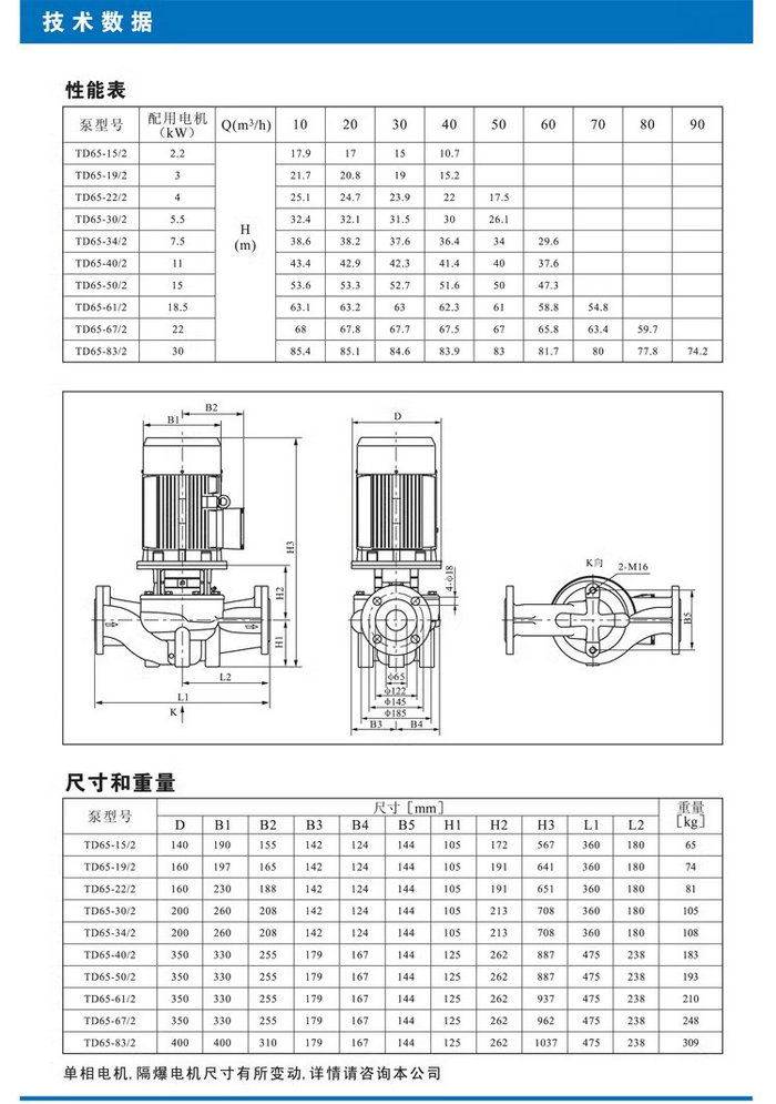 【南方】TD系列管道循环泵技术数据、性能参数、尺寸和重量