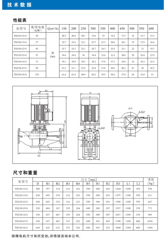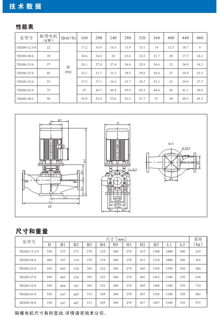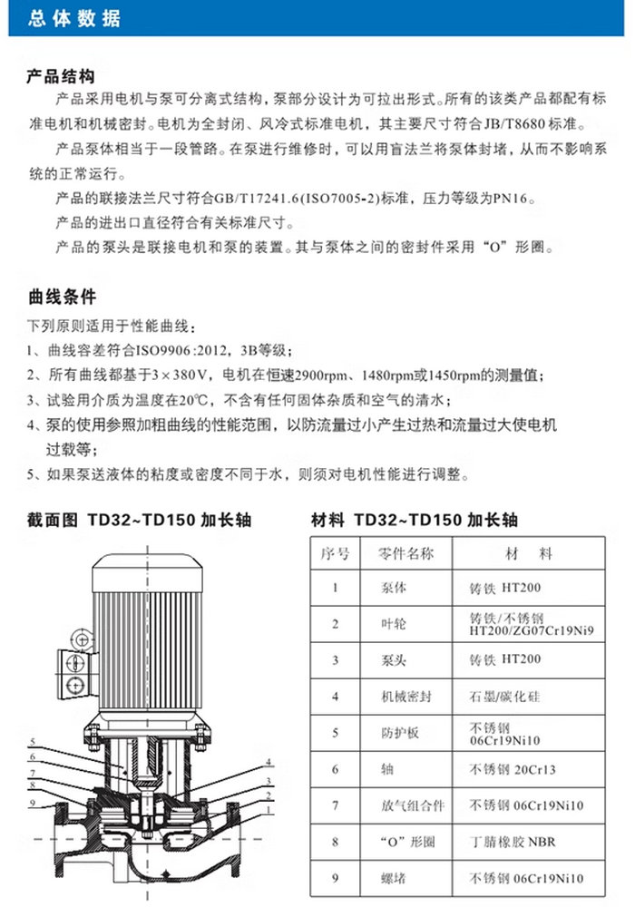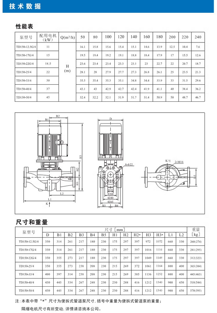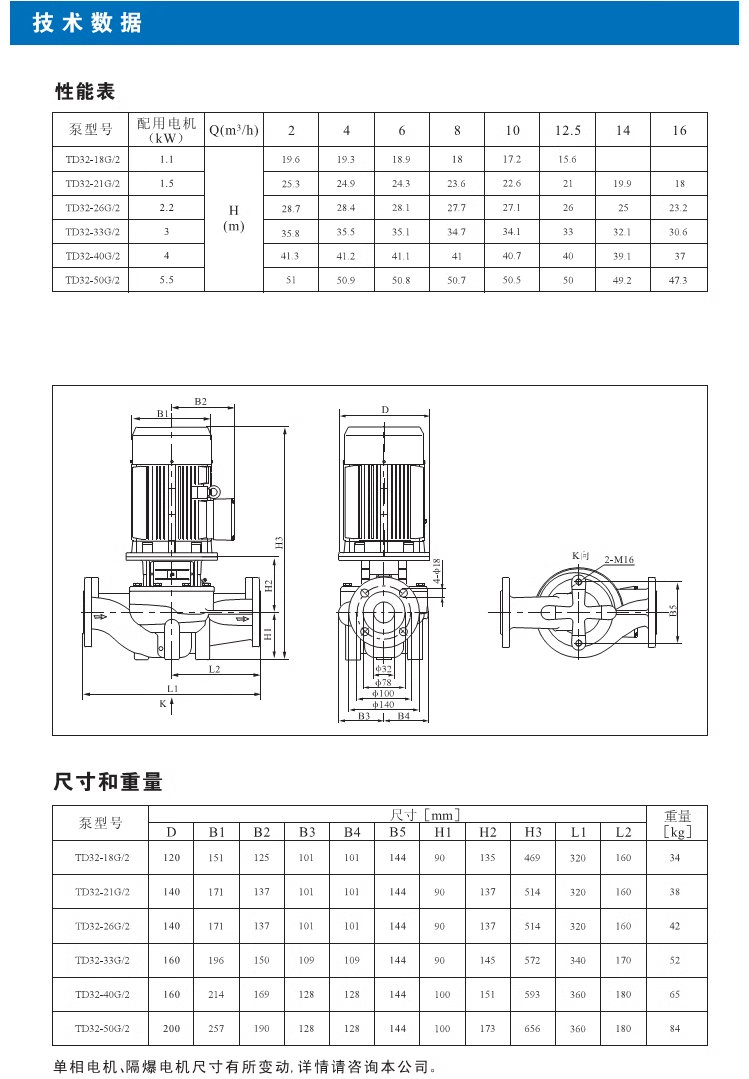 【南方】TD系列管道循环泵技术数据、性能参数、尺寸和重量